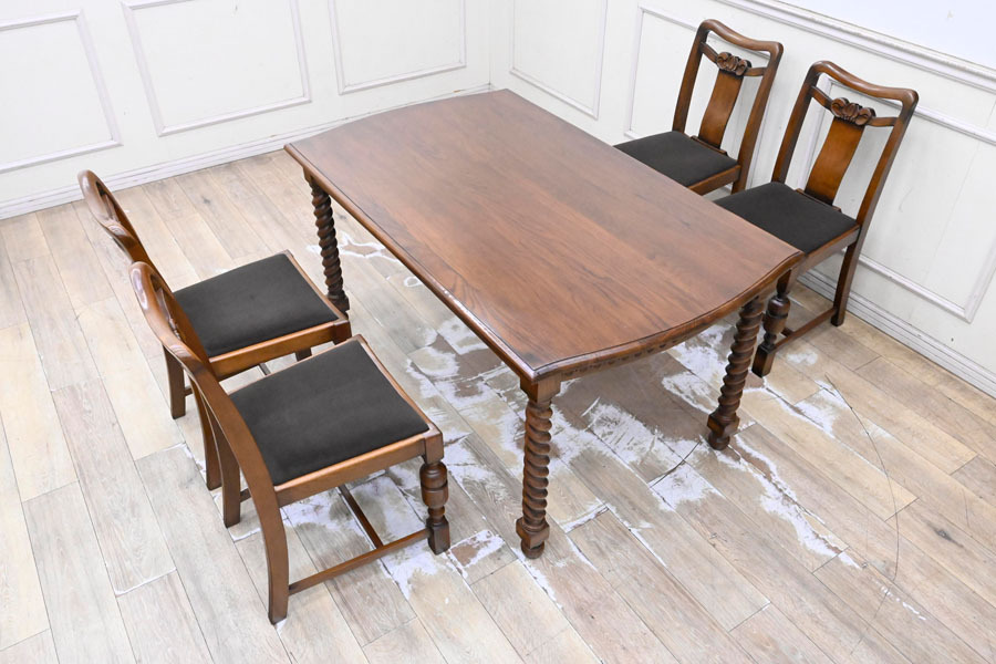 > DE10 美品 英国アンティーク調 イギリス調 オーク材 ダイニングセット 食卓テーブル 食卓机 食卓椅子 5点 ダイニングチェア 4人用