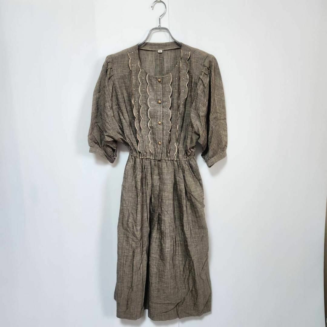 - ロングワンピース ブラウン系 L ヴィンテージ風 ウエストゴム 肩パット レトロ