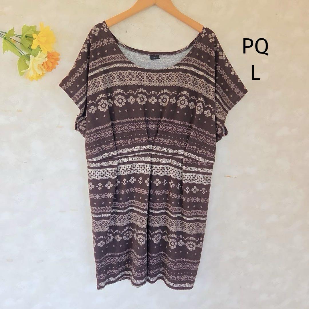 - PQ 膝丈ワンピース チュニック【L】半袖 ブラウン系 総柄 エスニック風