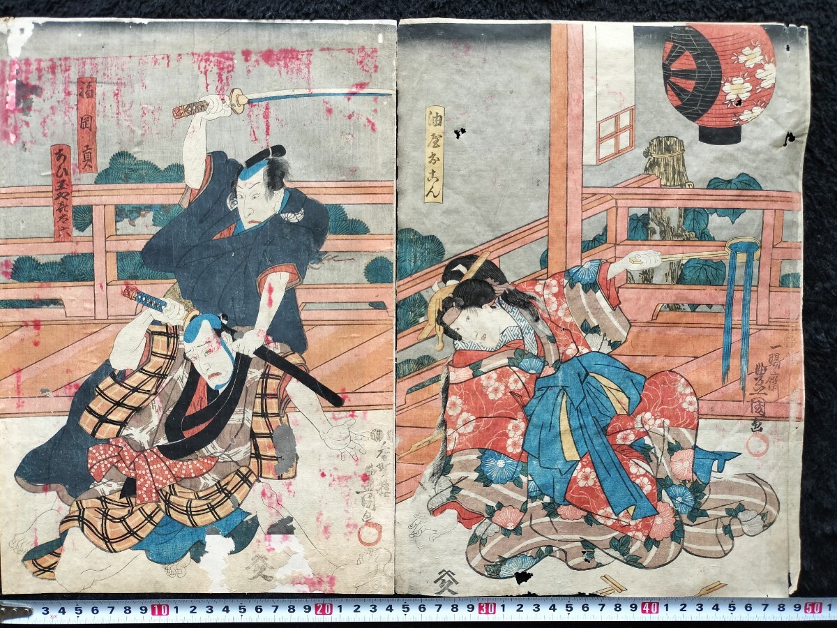 > 江戸期/真作 歌川豊国「役者」本物浮世絵木版画 歌舞伎絵 役者絵 芝居絵 錦絵 大判 二枚 裏打ち