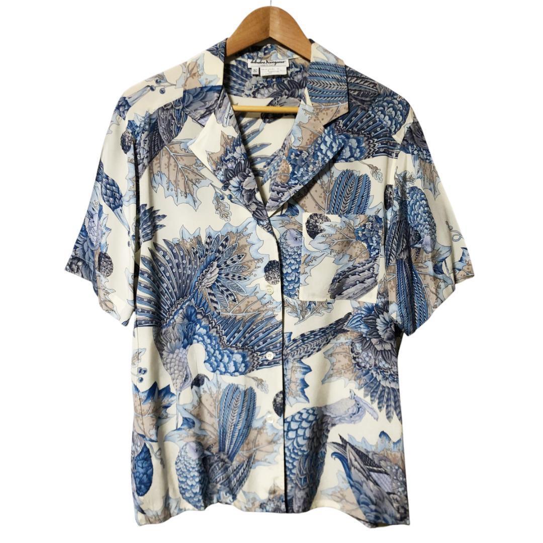 - Salvatore Ferragamo サルヴァトーレフェラガモ シルク100% 総柄 開襟 シャツ 半袖 鳥柄 S アイボリー 水色 イタリア製 ヴィンテージ A9