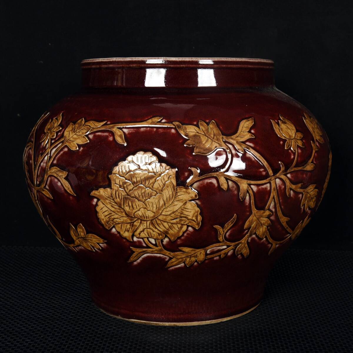 - ▽鴻▽ 元 古陶瓷品 霽紅釉 纏枝牡丹花紋罐 陶藝 陶瓷器 古賞物 古董品 時代物 稀少珍品 中国古玩 中国古美術