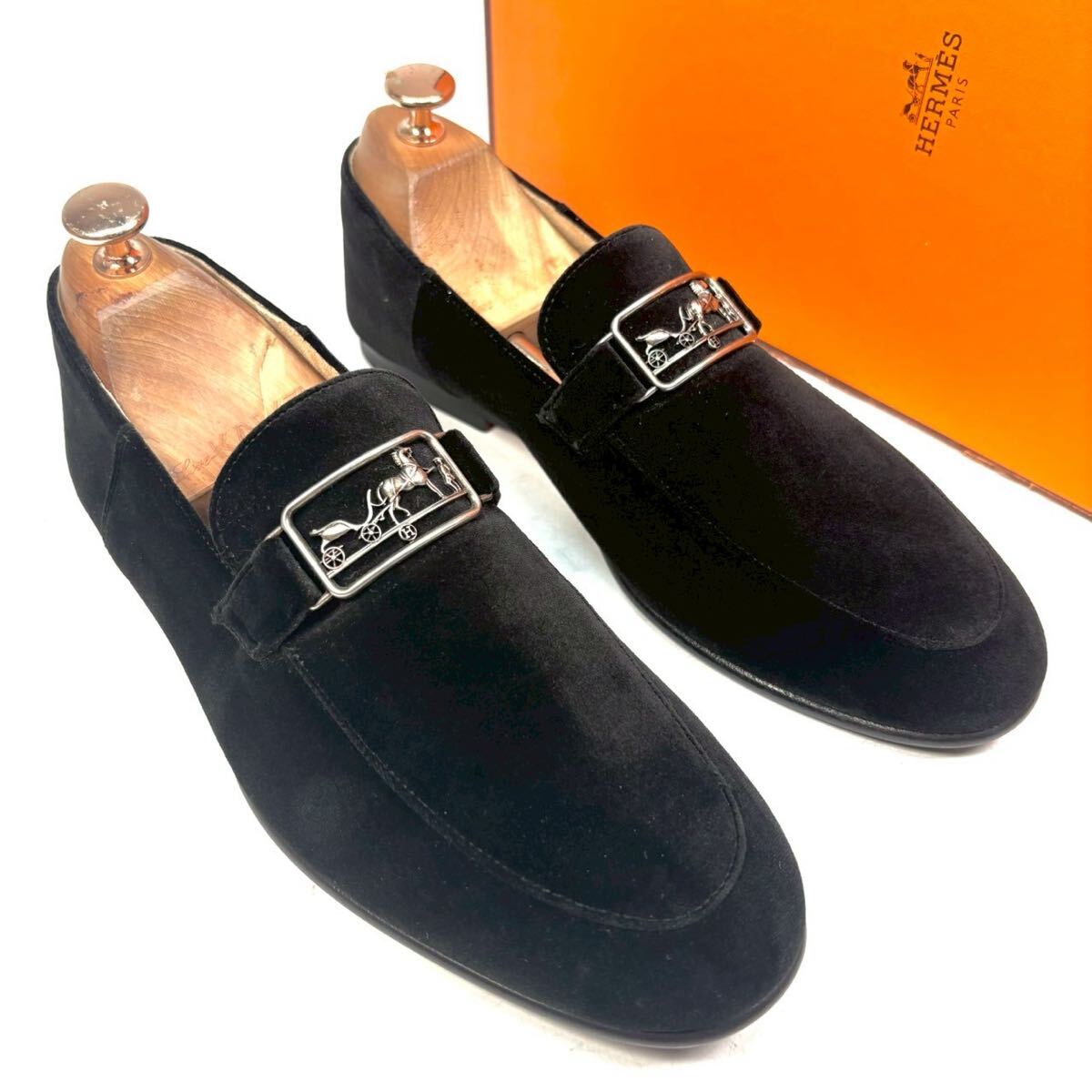 - HERMES エルメス ローファー ベロア 40 25.0cm馬車 ブラック 黒 メンズ 即決