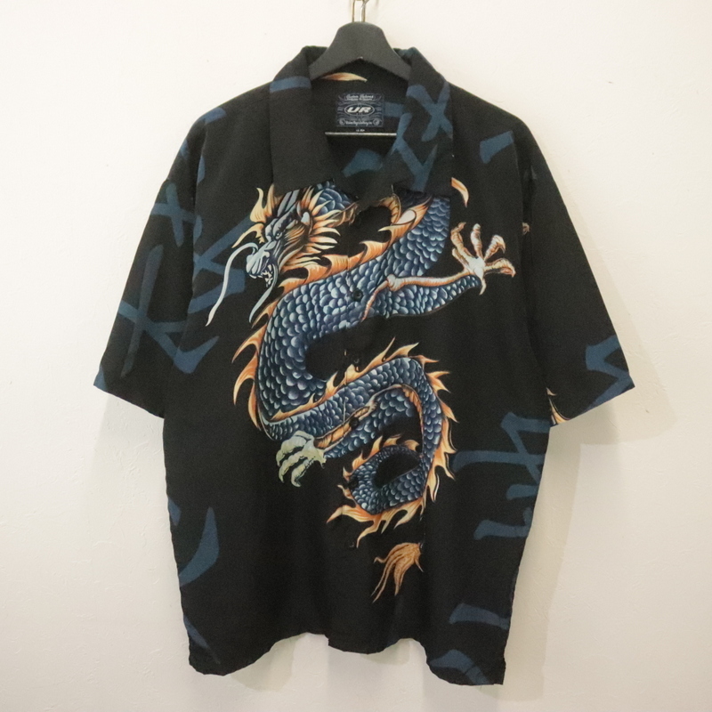 > j815 2000年代製 UR 半袖シャツ■00s 表記XLサイズ ブラック オープンカラー 開襟 チカーノ ポリエステル ドラゴン 古着 古着卸 オールド