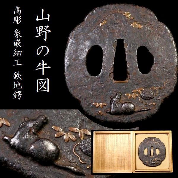 > 【 恵 #1752 】 雰囲気良き一品 厚みのある高彫細工 山野の牛図 象嵌細工 長径 8.3cm以上 鉄地大鍔 検:鍔/縁頭/刀剣/刀装具