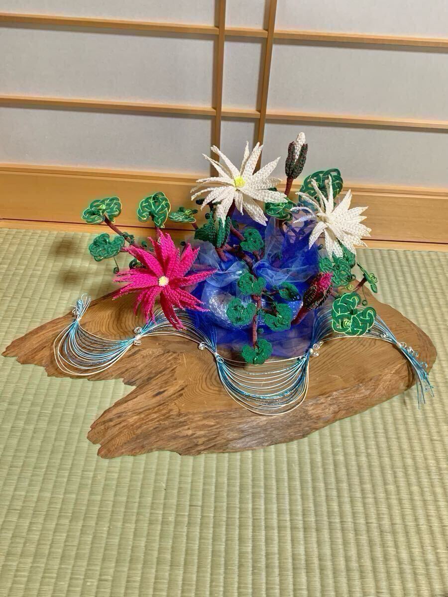 - 水引細工 ハンドメイド 蓮の花 波 天然木 花台 置物 和室飾り 和風 インテリア 水引 花 お盆飾り