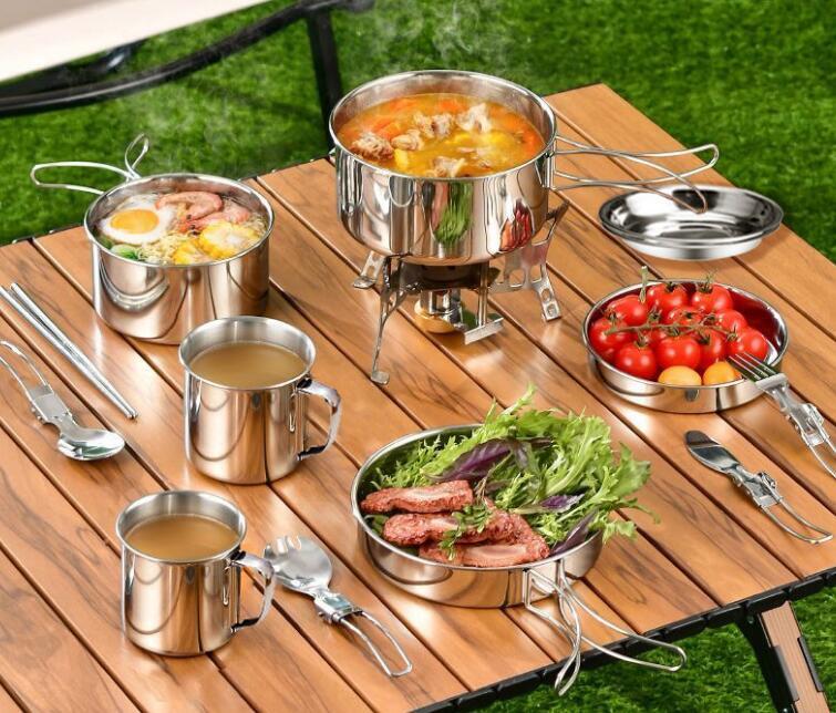 > 新入荷高品質食器 ステンレス製 携帯袋付 キャンプ用品 ステンレスマグ8点セット クッカー セット キャンプ用鍋 アウトドア調理器具