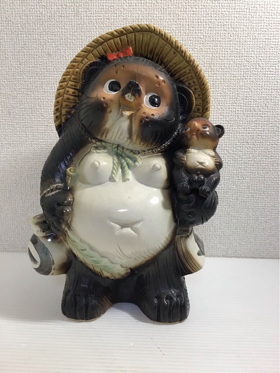 - 信楽焼? たぬき 置物 親子 陶器 高約33cm 女の子 赤ちゃん 商売繁盛 縁起物 オブジェ 玄関 狸