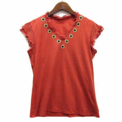 - ランバン LANVIN COLLECTION フラワーモチーフ フリル Vネック カットソー Tシャツ 半袖 オレンジ レディース