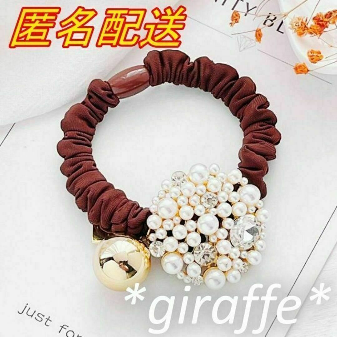 - E266 匿名配 ヘアゴム ラウンド パール モチーフ ラインストーン ブラウン 髪ゴム ヘアアクセサリー