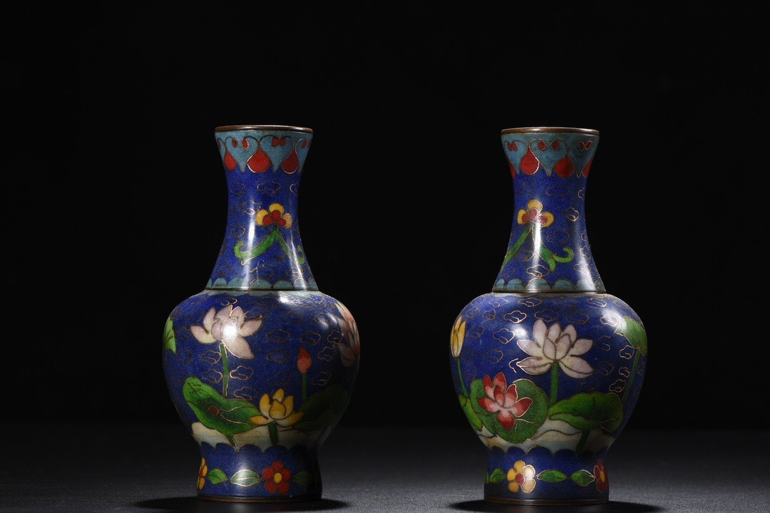- 【超珍館蔵】銅製 景泰藍 琺瑯彩 一品清廉紋 賞瓶一對 置物 賞物 古賞物 古董品 古美術品 時代物 旧家蔵出 稀少珍蔵品