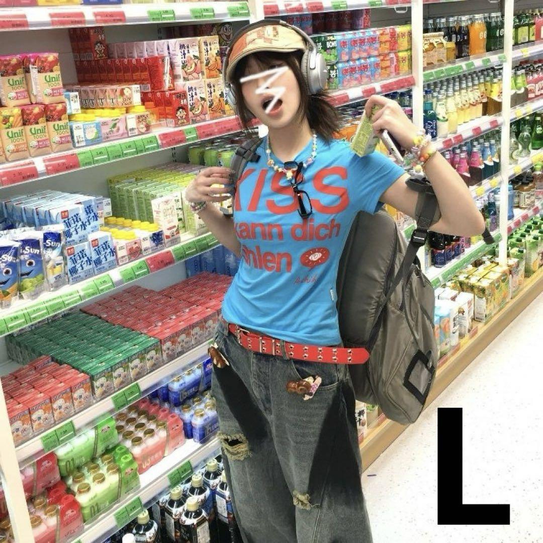 > 半袖Tシャツ L Y2K ピチT グランジギャル 原宿 韓国 ブルー 平成ギャル プリント