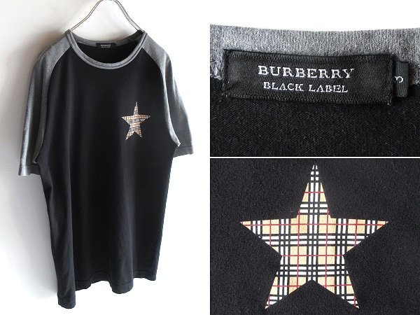 - 希少 BURBERRY BLACK LABEL バーバリーブラックレーベル ノバチェックスター ロゴワッペン Rockstarプリント ラグランTシャツ 3 黒 グレー