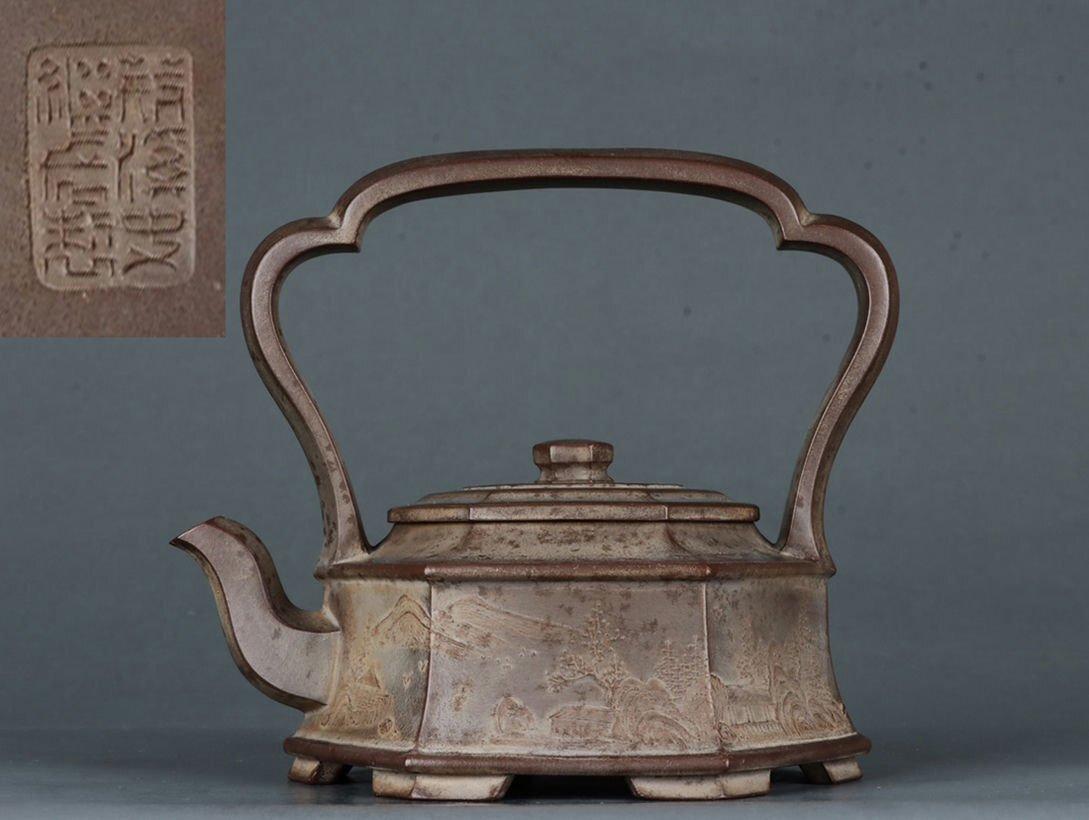 - ■観心・時代旧蔵■R4661泥絵山水六方提梁紫砂壺 在銘 史繼長 清時代 時代朱泥 在銘 /紫砂 煎茶道具 朱泥 茶壺