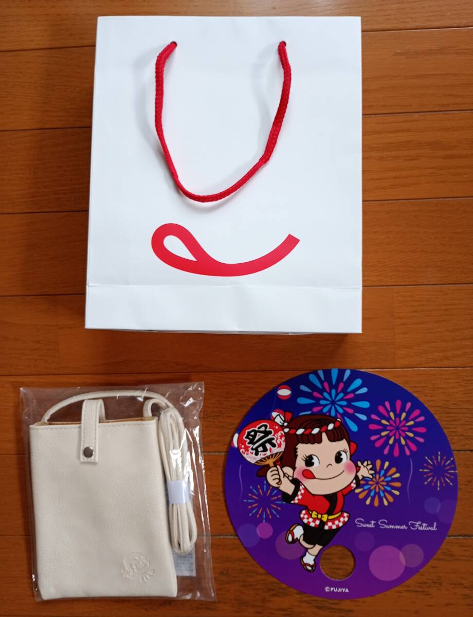 - 不二家 ペコちゃん オリジナル スマホポーチ オフホワイト うちわ お祭り はっぴペコちゃん 花火 ノベルティ