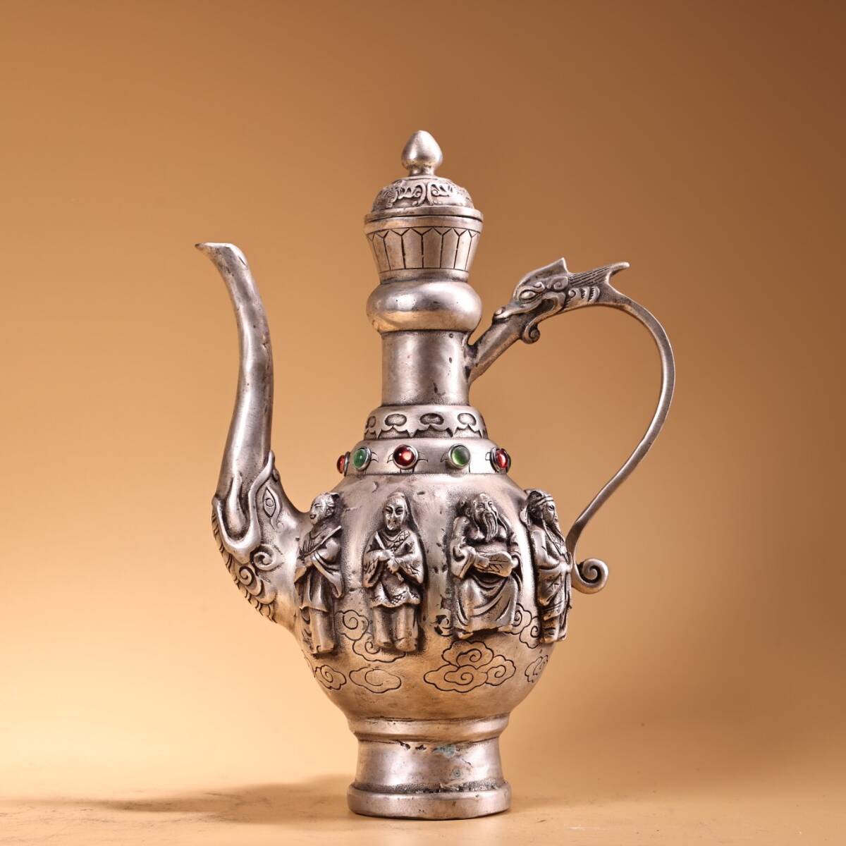 - ▽鴻▽ 銅製 銀鍍 八仙紋 酒壺 置物 賞物 古賞物 古董品 時代物 稀少珍品 中国古玩 中国古美術