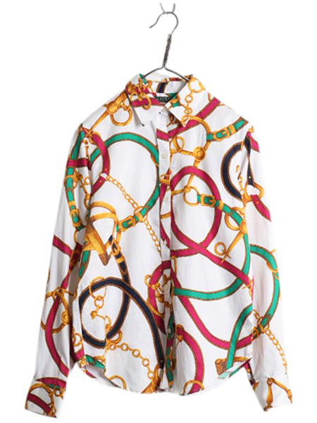 > 00s ローレン ラルフローレン 総柄 長袖 シャツ レディース M 程 オールド 馬具 チェーン ビット ブラウス きれいめ ゆったり マルチカラー