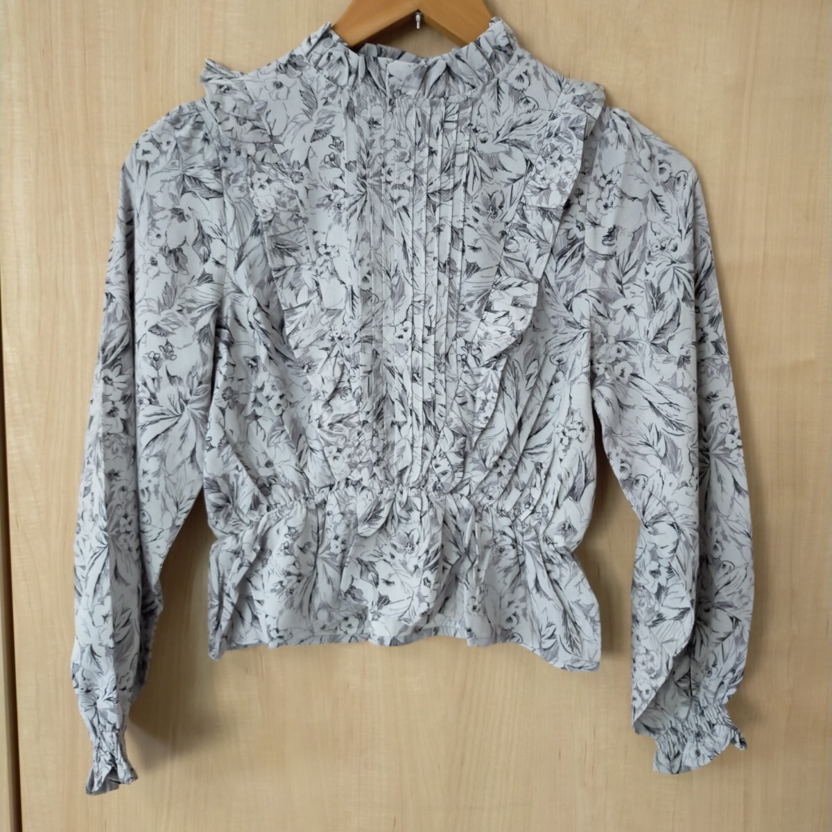 - 花柄フリル長袖ブラウス グレー XS 新品未使用