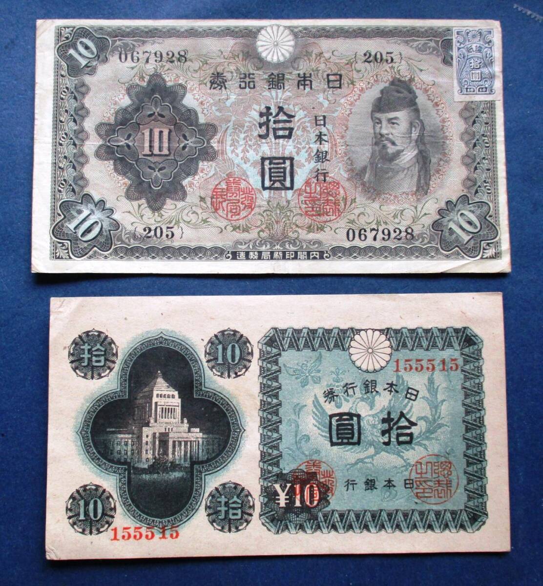 - 日本紙幣 2次10円証紙付067928、議事堂10円美品1555515 計2枚 EE43 画像参照してください。