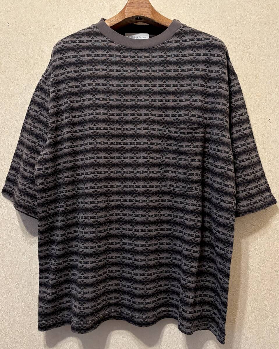 > 美品USA製THREADS&THINGSネイティブ総柄ボーダー胸ポケットTシャツL~ビッグシルエットMグレー黒ジャガード編み柄レーヨン混ポケT米国製US製