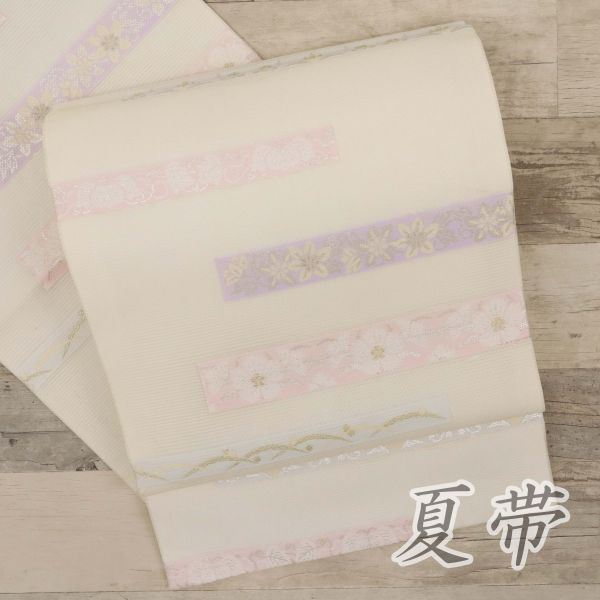 > 【袋帯】 夏帯 『絽』 横段に露芝花模様 白アイボリー 正絹着物 FY5-1