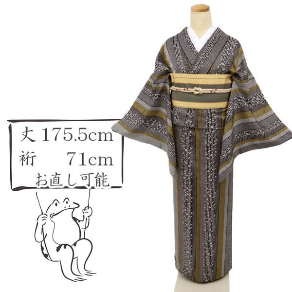 - 【小紋】 長尺 細やか縞模様に桜の舞花模様 黒地 袷正絹着物 KB3-14