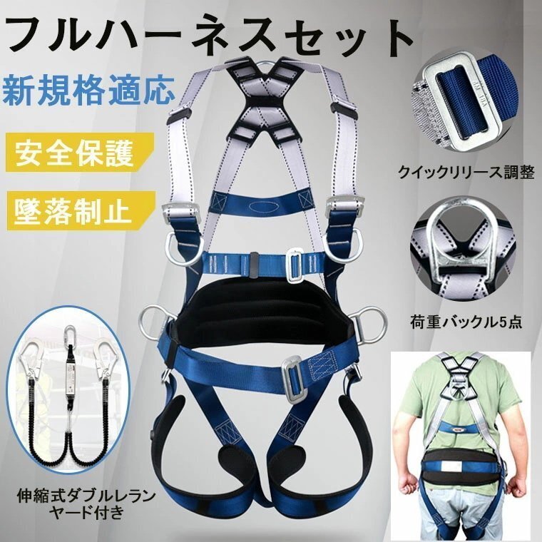 > フルハーネスセット 墜落制止用器具 ワンタッチバックル 伸縮式ダブルランヤード付き 軽量モデル 全身保護 高所安全作業用 新規格適合