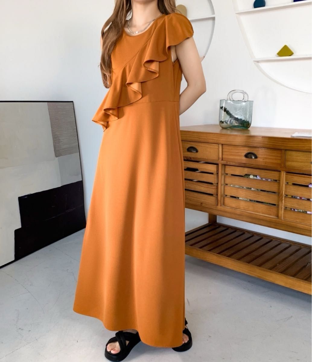 - emi+ ノースリーブワンピース ブラウン 茶色 ロング 体型カバー すっきりシルエット M~L