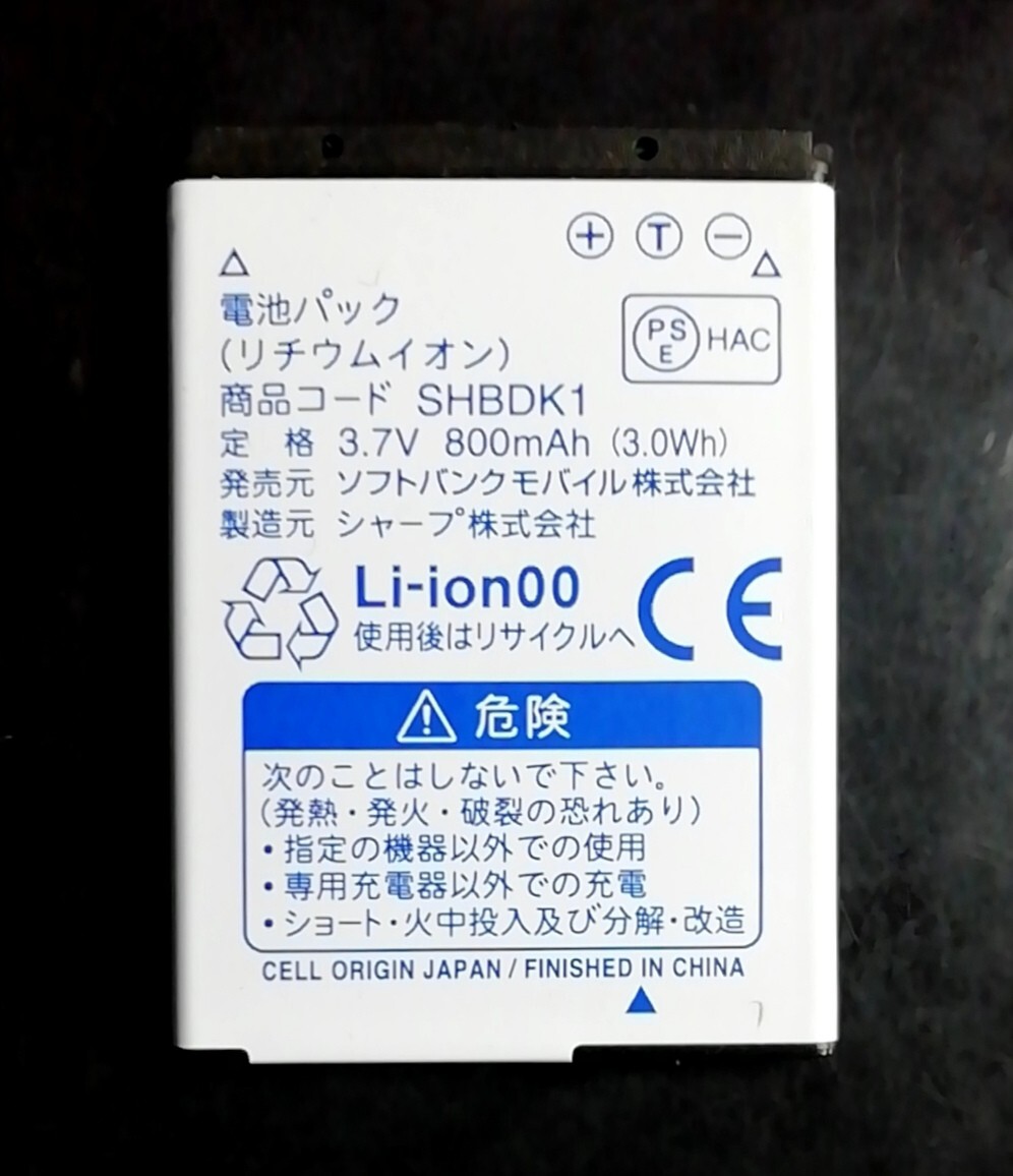 - 【中古・残り1個】ソフトバンク純正SHBDK1電池パックバッテリー【充電確認済】対応機種(参考)002SH/004SH/109SH/301SH