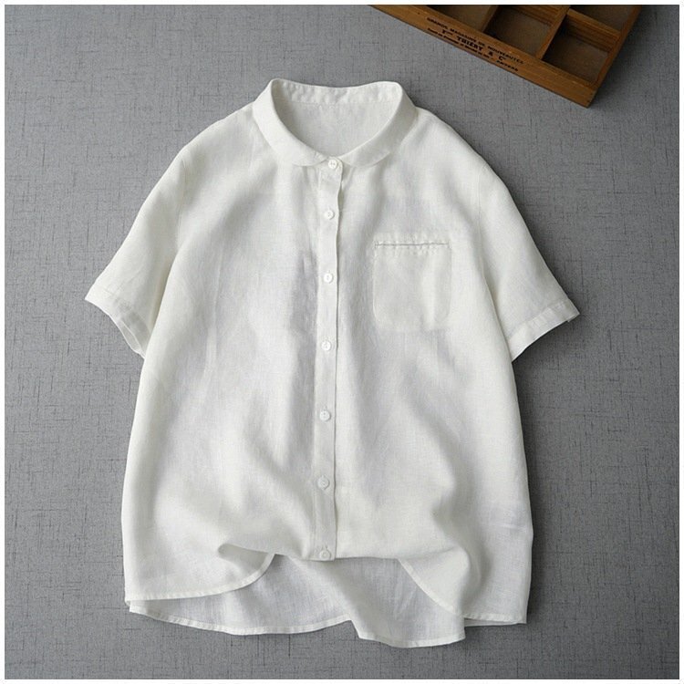 - シャツブラウス レディース 丸襟 半袖 リネンシャツ 夏 トップス カジュアル 無地 ナチュラル ホワイト L