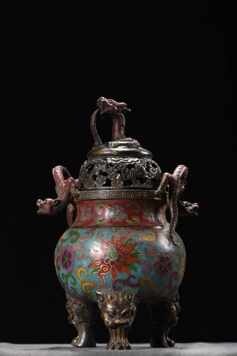 - 蔵友旧蔵出 銅製 景泰藍 琺瑯彩 雙盤龍耳三獣足 熏香爐 希少珍品 貴重品 置物 古賞物 密宗密教 供養品 仏教美術品