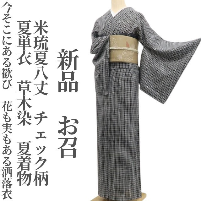 - tomihisa 新品 夏単衣 草木染 米琉夏八丈 チェック柄 夏着物“今そこにある歓び…花も実もある洒落衣”正絹 仕付け糸付 お召 6387
