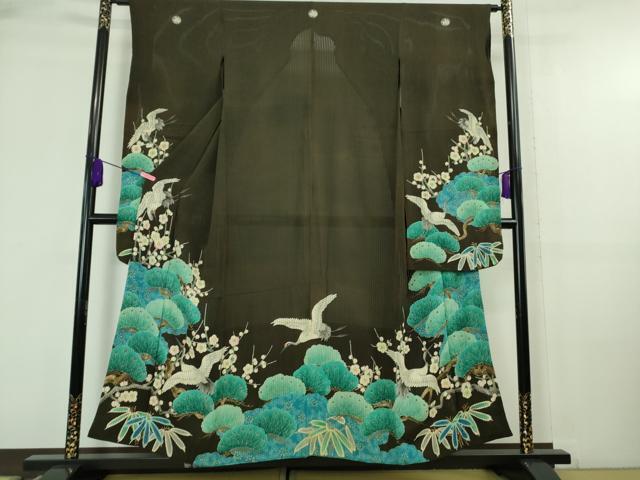 > 平和屋本店■希少 夏物 アンティーク 大正ロマン 振袖 縦絽 相良刺繍 飛鶴松竹梅 黒地 逸品 DZAA7073kh5