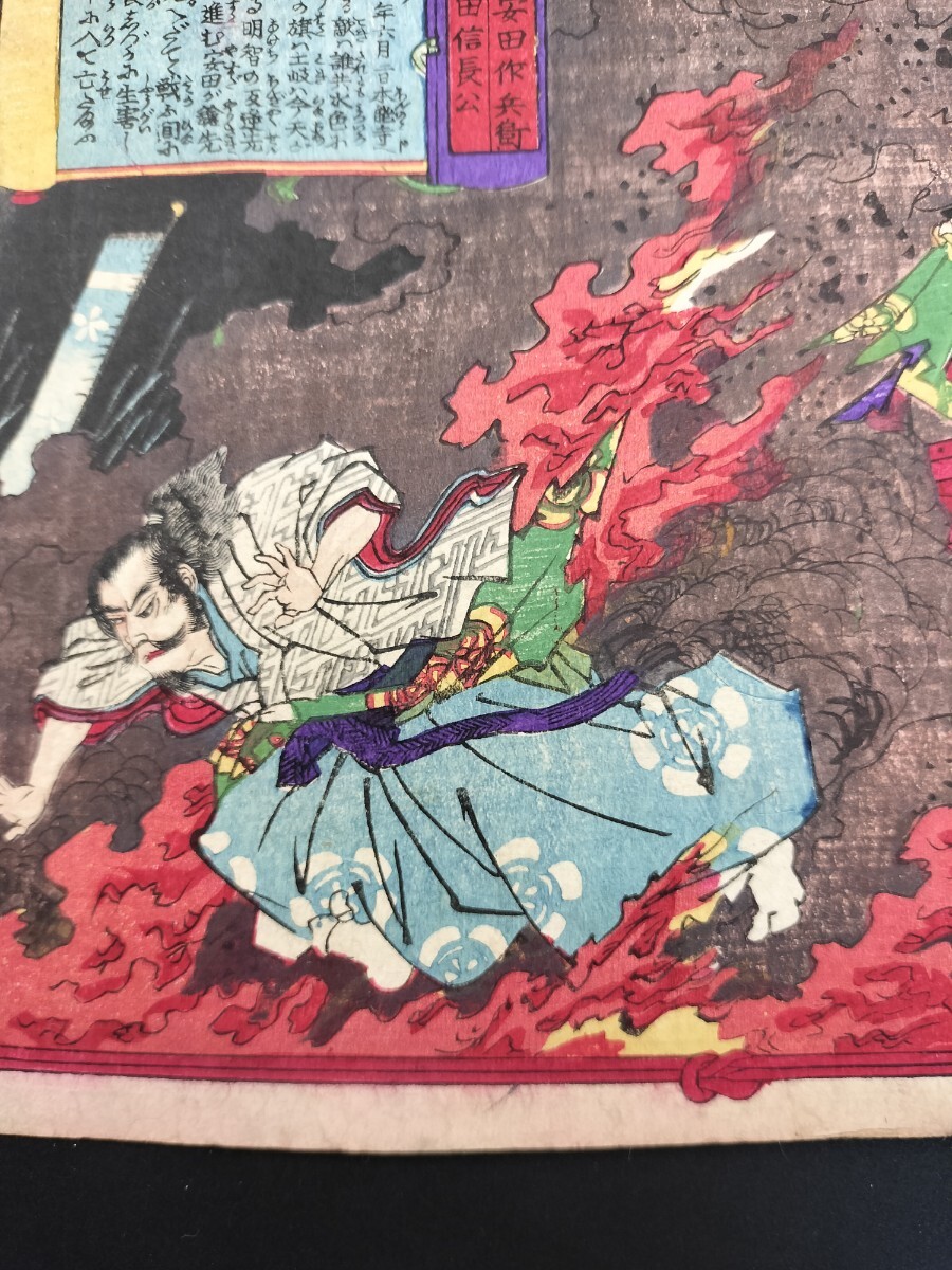 - 火!明治期/真作 楊洲周延「本朝武勇鑑 織田信長」本物浮世絵木版画 武者絵 錦絵 中判 裏打ち