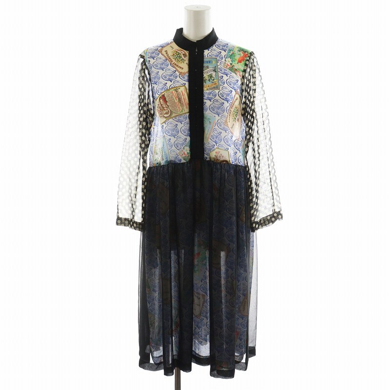 - トリココムデギャルソン tricot COMME des GARCONS AD2012 ワンピース ロング丈 長袖 総柄 水玉模様 ティーカップ柄 S 青 黒