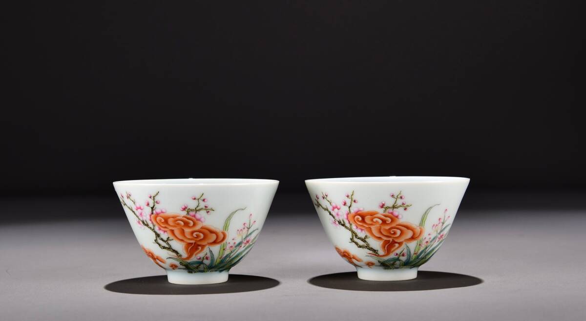 - 蔵友旧蔵出 清 雍正年製款 粉彩 蘭草靈芝紋 供杯一對 稀少珍品 貴重品 古陶瓷品 置物 古賞物 中国古玩 中国古美術品
