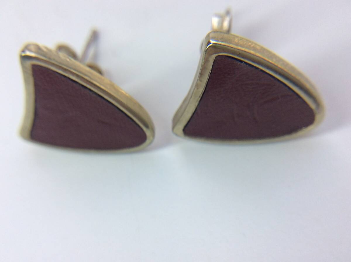 - A-54-3-2 バーガンディ レザーインレイ 三角スタッドピアス