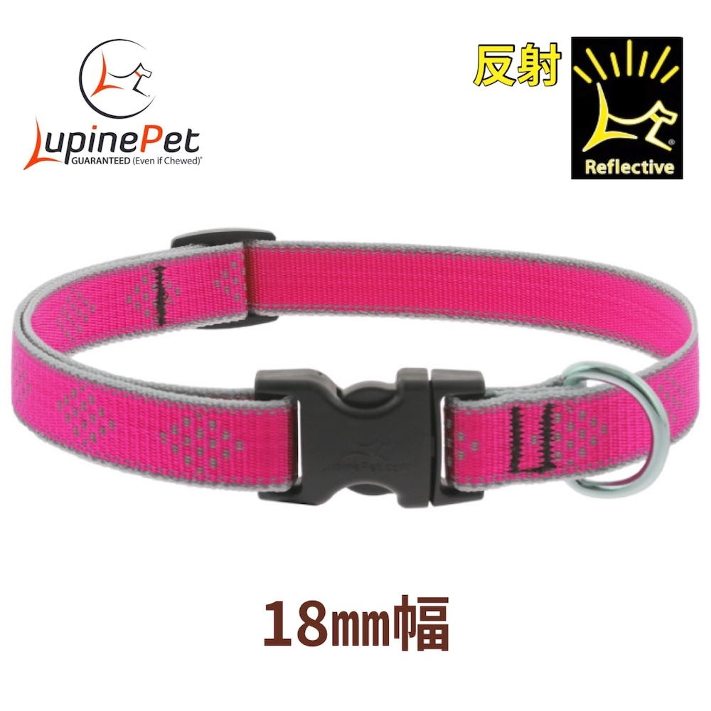 - ワンタッチ首輪・Mサイズ・18mm幅 リフレクティブ・反射・ピンクダイヤモンド柄 33-56cm LUPINEルパイン アメリカ製 軽量丈夫
