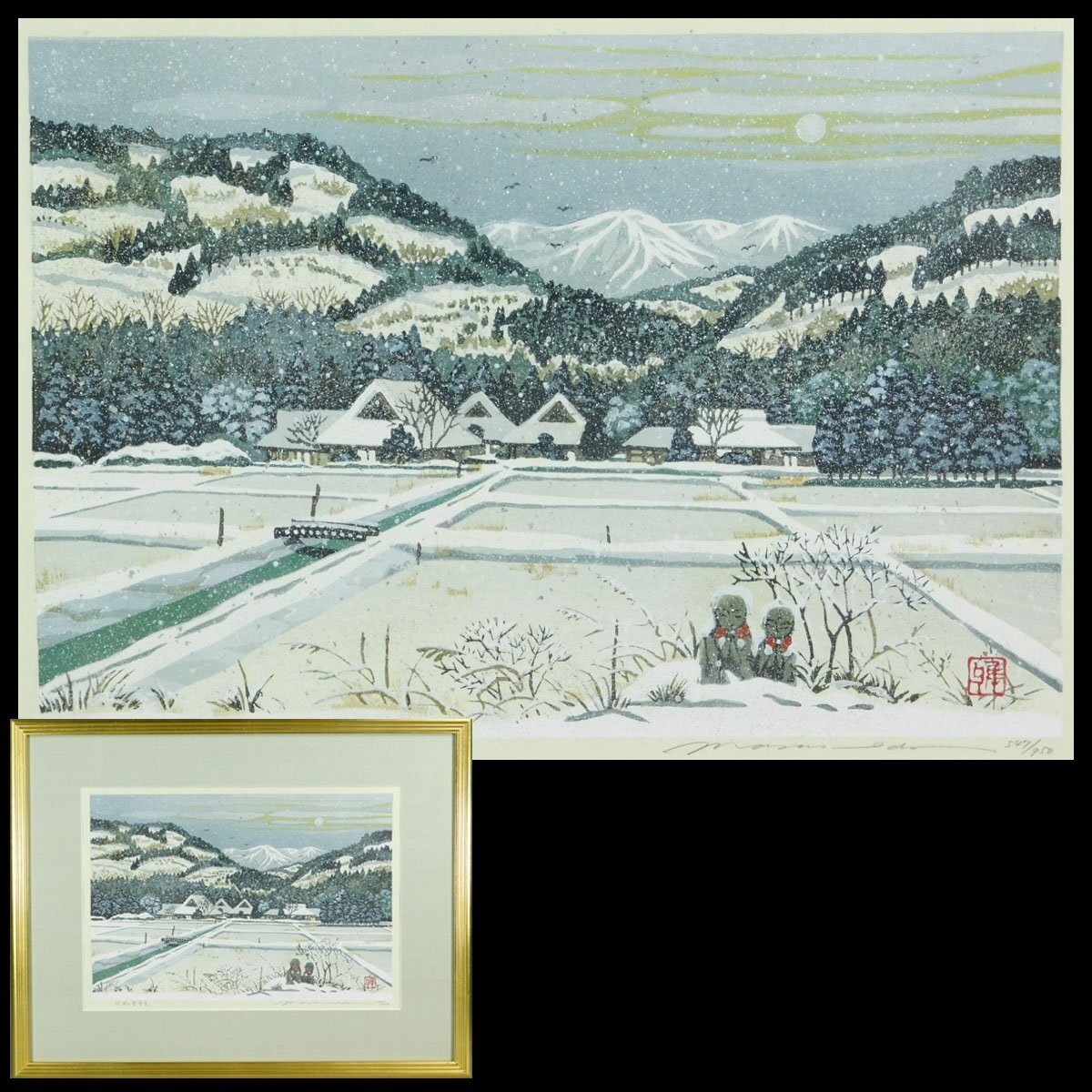 > 井堂雅夫「冬 故郷の冬景色」金銀箔 手彩木版画 三十五版五十一摺 額装 専用紙箱 販売パンフレット 日本の四季より ka2507N21