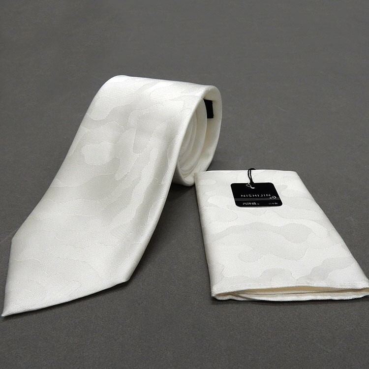 - 西陣織 フォーマルタイ チーフ付 白 迷彩/カモフラ シルク100% 日本製 礼装 結婚式・披露宴 ポスト投函便送料無料 njc56-WH