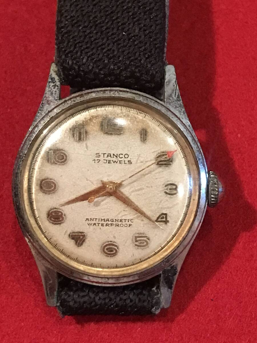 > A9491●レトロ 腕時計 STANCO スタンコ 17JEWELS ANTIMAGNETIC WATERPROOF ベルト布製 キズ汚れハゲなどあり 動作未確認 ジャンク品