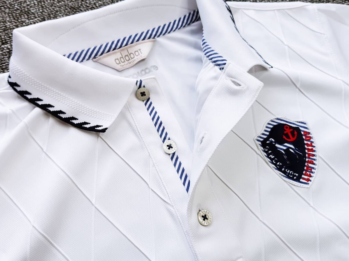 > 極美品!adabat アダバット 立体スクエアチェック 胸エンブレム 高品質 半袖ゴルフポロシャツ(白46=L相当)価格19800円 ワールド