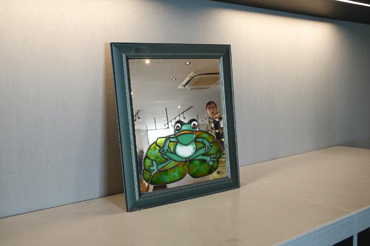 > ○可愛いカエルの絵 グリーンの木枠の壁掛けミラー 鏡 ステンドグラス ナチュラル 工芸 ヴィンテージ 古道具のgplus広島 2507i