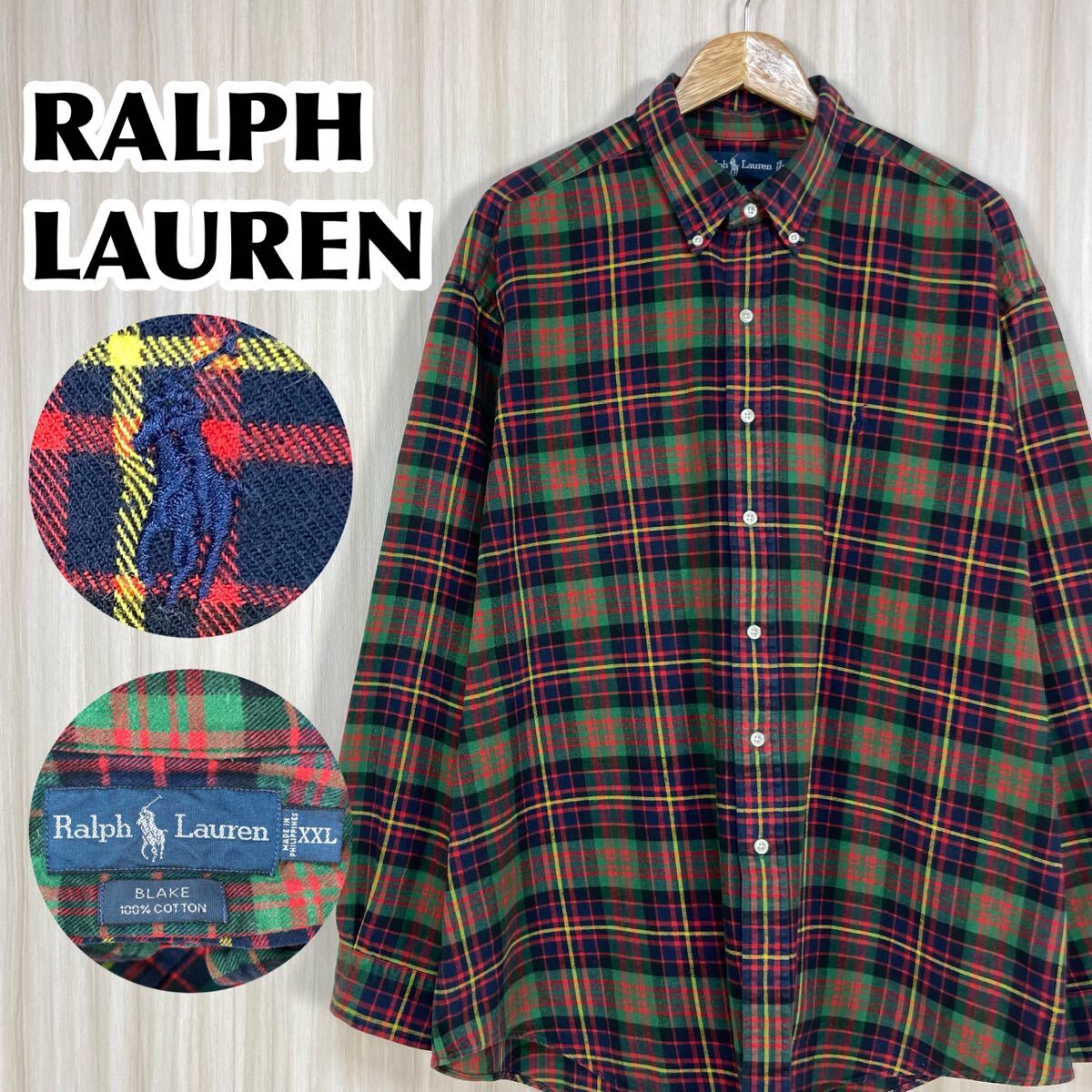 > ☆希少☆RALPH LAUREN ラルフローレン 長袖ネルシャツ XXL ボタンダウン マドラスチェック グリーン×ネイビー 刺繍ポニー 90s 古着