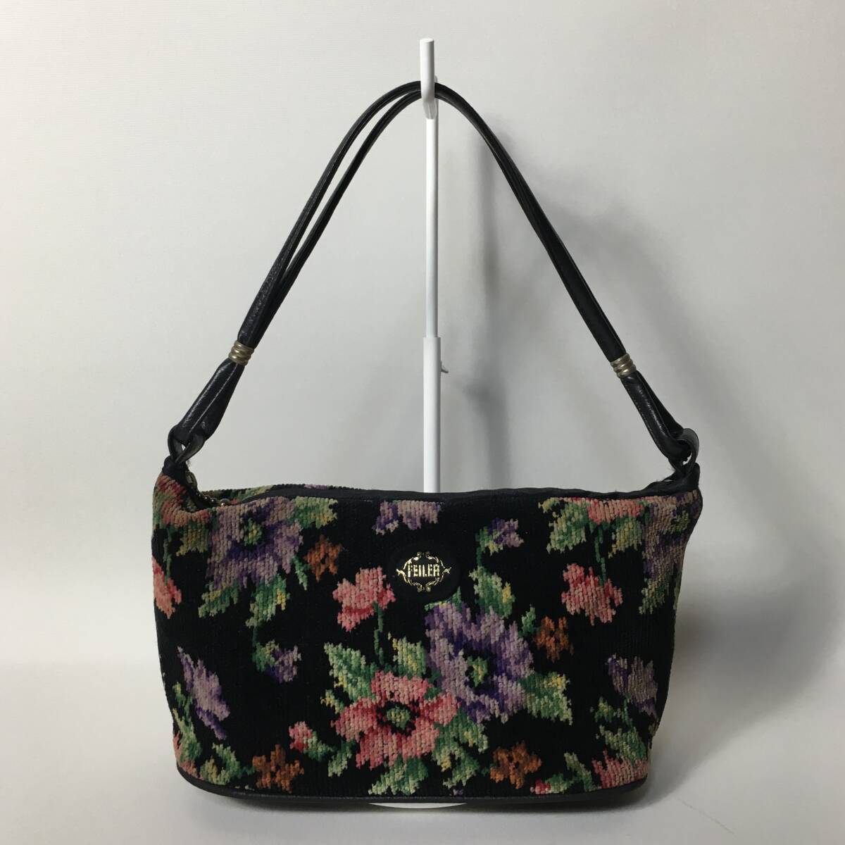 - 77B54|フェイラー ハンドバッグ シュニール織 ブラック 花柄刺繍