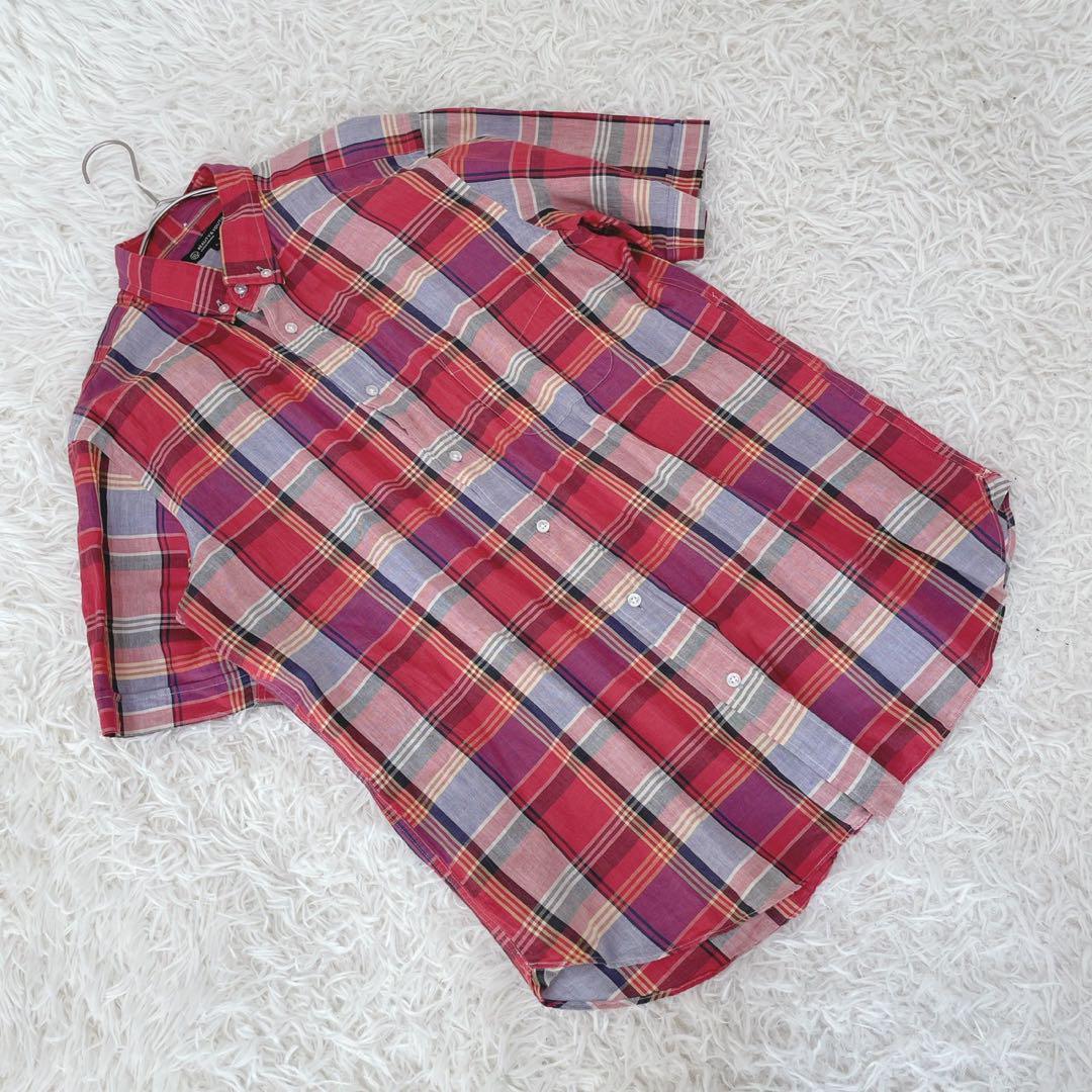- 『ビューティーアンドユース』 (L) ボタンダウン半袖シャツ チェック リネン混