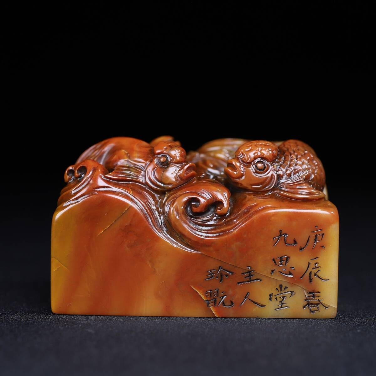- 唐物 清 寿山石『金玉満堂』金魚ボタン印鑑 天然石 篆刻 古印材 極細工 時代物 中国古玩 骨董品 D67
