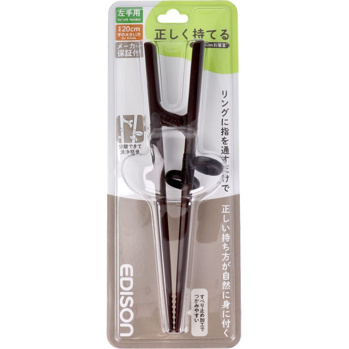 ▼▼▼▼▼▼注意事項▼▼▼▼▼▼・送料込み(送料700円が商品価格に含まれています) 一部地域では追加送料あり。・お取り寄せ商品です。弊社にて手配後、メーカー・卸業者からの直送になります。・まれにメーカー欠品、出荷遅延等が発生致します。問題発生時は別途メールにてご連絡致します。・配送方法の指定、日時指定、置き配、ギフト対応、他商品との同梱配送などは対応できません。・まとめ買いや複数購入の場合は通常より発送に時間が掛かる場合がございます・複数個口の場合、2階以上への搬入ができない場合があります。(その場合は1階での受け渡しとなります)・大型連休、お盆、年末年始などは発送をお休みさせていただく場合がございます・メーカー都合により、パッケージは予告なく変更される場合がございます・梱包用のダンボールはリサイクル品を使用させていただきます。・注文に関するご連絡(注文確定通知・発送通知など)はメールでご案内させていただきます※商品ページの内容について、少しでもご不明な点などがございましたら購入前に一度ご連絡ください▲▲▲▲▲▲注意事項▲▲▲▲▲▲〇商品説明正しいお箸の持ち方は日々の練習から!●リングに指を入れるだけで正しい持ち方が自然に身に付きます。●持ち方にお悩みの方や食事のリハビリ用として幅広い方々にお使いいただけます。●本物ならではの使いやすさ!●生活に馴染むダークブラウンカラー●指の角度を補助するリングで正しく使える●連結部でお箸一本一本を固定し交差箸防止●すべり止め加工の箸先でつかみやすい●連結部が分離できて洗浄が簡単●リングを外して普通のお箸に近い状態で使用できる【対象年齢】手の大きい方・男性向【材質】お箸・・・ABS樹脂リング・・・シリコーンゴム【サイズ】20cm【耐熱温度】お箸・・・80度リング・・・120度【消毒方法】お箸・・・煮沸消毒:×、食洗機・乾燥機:×リング・・・煮沸消毒:〇、食洗機・乾燥機:〇【注意】・必ず指導者の目の届く所でご使用ください。・用途目的以外のご使用はおやめください。・キズ、破損、亀裂、変形などが生じた場合は、すぐにご使用をおやめください。・箸先がとがっていますので、使用時は十分にご注意ください。・持ったまま転ぶと、目やのどに当たり思わぬケガをする場合があります。・リングは指からすぐに外れない場合がありますのでご注意ください。・初めてご使用される前に、必ず洗浄をしてください。・ご使用後は必ず洗浄をしてください。洗浄の際は柔らかいスポンジと食器用洗剤をご使用ください。磨き粉やたわしなどのご使用はおやめください。・ご使用後はよく水を切って乾燥させて保管してください。・リングは、強く引っ張ったり、無理に奥まで指を入れたりすると切れる場合があります。・直火、オーブングリル、電子レンジではご使用いただけません。・火の側に置かないでください。・本製品の上に重いものを載せないでください。※使用条件と使用頻度により変形や劣化の時期は異なります。・連結部を分解する際は必ず下記をお読みの上、分解して下さい。無理な方向の分解は連結部分の破損や劣化の原因となります。・連結部を外す時はお箸の上部を持ち、左右に引き抜いてください。・お箸の下部を広げると破損の原因となります。絶対におやめください。・煮沸消毒は大きめの鍋にたっぷりお湯を入れ、2〜3分間煮沸してください。・食器洗浄機や食器乾燥機をご使用の際は、各使用方法に従ってください。〇商品仕様個装サイズ:95X250X27mm個装重量:約40g内容量:1個入製造国:韓国【発売元:株式会社ケイジェイシー】(出典:アサヒ興洋)
