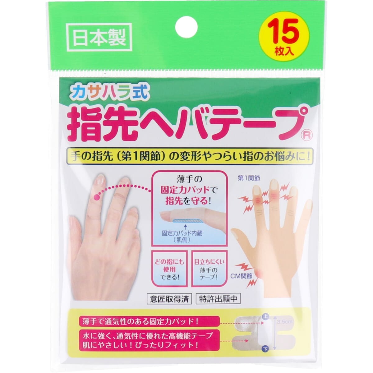 ▼▼▼▼▼▼注意事項▼▼▼▼▼▼・送料込み(送料700円が商品価格に含まれています) 一部地域では追加送料あり。・お取り寄せ商品です。弊社にて手配後、メーカー・卸業者からの直送になります。・まれにメーカー欠品、出荷遅延等が発生致します。問題発生時は別途メールにてご連絡致します。・配送方法の指定、日時指定、置き配、ギフト対応、他商品との同梱配送などは対応できません。・まとめ買いや複数購入の場合は通常より発送に時間が掛かる場合がございます・複数個口の場合、2階以上への搬入ができない場合があります。(その場合は1階での受け渡しとなります)・大型連休、お盆、年末年始などは発送をお休みさせていただく場合がございます・メーカー都合により、パッケージは予告なく変更される場合がございます・梱包用のダンボールはリサイクル品を使用させていただきます。・注文に関するご連絡(注文確定通知・発送通知など)はメールでご案内させていただきます※商品ページの内容について、少しでもご不明な点などがございましたら購入前に一度ご連絡ください▲▲▲▲▲▲注意事項▲▲▲▲▲▲〇商品説明薄手の固定力パッドで指先を守ります。水に強く通気性に優れた高機能テープは肌にやさしく、ピッタリフィットします。●薄手で通気性のある固定力パッドです。●どの指にも使用できます。●目立ちにくい薄手のテープです。★「へバーデン」とは、手の爪の下のすぐ下の第一関節が太く変形したり、骨が隆起したりする状態です。【素材】テープ:ポリウレタンパッド:ポリエステル【装着方法】(1)短い羽根が上、長い羽根が下になるように貼る。中央のはくり紙を両方に開く。(2)装着する指の第二関節を90度に曲げ、固定力パッドがついている面を指の腹側に当て、テープの端を第二関節の付け根付近に合わせて貼り付ける。(3)左右のはくり紙を片方ずつはがし、指の先端が浮かないように貼る。テープは引っ張らず、弱く巻き付ける。(4)完成★親指・小指の場合・小指など短く細い指は指を伸ばしたまま全体に貼る。・親指など太い指は、1枚は腹側に貼り、もう一枚は背側からはさむように貼るとよい。・いずれも爪にかからないように弱く貼る。【注意】・テープは引っ張らずに弱く巻き付けてください。・指にキズ等がある場合はご使用を控えてください。・ご使用前はテープ付着部にクリーム等を塗らないでください。・テープをはがす時は皮膚を傷めないようゆっくりはがしてください。・万が一、ご使用中に発疹・かゆみ・かぶれなどの異常が生じた場合は直ちに使用えを中止し、専門医にご相談ください。・本品を医療目的で使用しないでください。〇商品仕様個装サイズ:100X135X5mm個装重量:約21g内容量:15枚入製造国:日本【発売元:株式会社ミノウラ】(出典:ミノウラ)