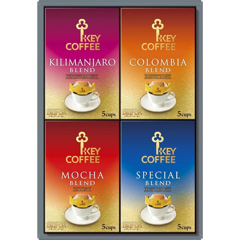 ▼▼▼▼▼▼注意事項▼▼▼▼▼▼・送料込み(送料800円が商品価格に含まれています) 一部地域では追加送料あり。・お取り寄せ商品です。弊社にて手配後、メーカー・卸業者からの直送になります。・まれにメーカー欠品、出荷遅延等が発生致します。問題発生時は別途メールにてご連絡致します。・配送方法の指定、日時指定、置き配、ギフト対応、他商品との同梱配送などは対応できません。・まとめ買いや複数購入の場合は通常より発送に時間が掛かる場合がございます・複数個口の場合、2階以上への搬入ができない場合があります。(その場合は1階での受け渡しとなります)・大型連休、お盆、年末年始などは発送をお休みさせていただく場合がございます・メーカー都合により、パッケージは予告なく変更される場合がございます・梱包用のダンボールはリサイクル品を使用させていただきます。・注文に関するご連絡(注文確定通知・発送通知など)はメールでご案内させていただきます※商品ページの内容について、少しでもご不明な点などがございましたら購入前に一度ご連絡ください▲▲▲▲▲▲注意事項▲▲▲▲▲▲〇商品説明“挽きたての香り”と“格別なおいしさ”をお届けするプレミアムドリップコーヒーの「ドリップ オン」ギフトです。バラエティに富んだ詰め合わせを、お楽しみいただけます。〇商品仕様【パッケージサイズ】225×75×330mm【内容】スペシャルブレンド・モカブレンド・キリマンジャロブレンド・コロンビアブレンド各(8g×5p)×各1【生産国】日本【パッケージ形態】化粧箱入【保存方法】常温【賞味期限】製造日より約540日(出典:キーコーヒー)